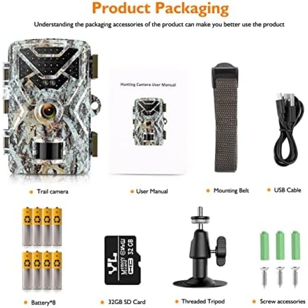 【IP65 WATERPROOF & MULTIFUNCTIONAL】This hunting & trail camera has plastic case and silicone sealing ring.It reaches the waterproof level of IP65,which is extremely suitable for field shooting.Besides,this wildlife camera can also be used as home security surveillance, surveillance warehouses, farm guards. Package includes 32GB Micro SD card and 8 batteries. This trail & game camera is equipped with everything you need.