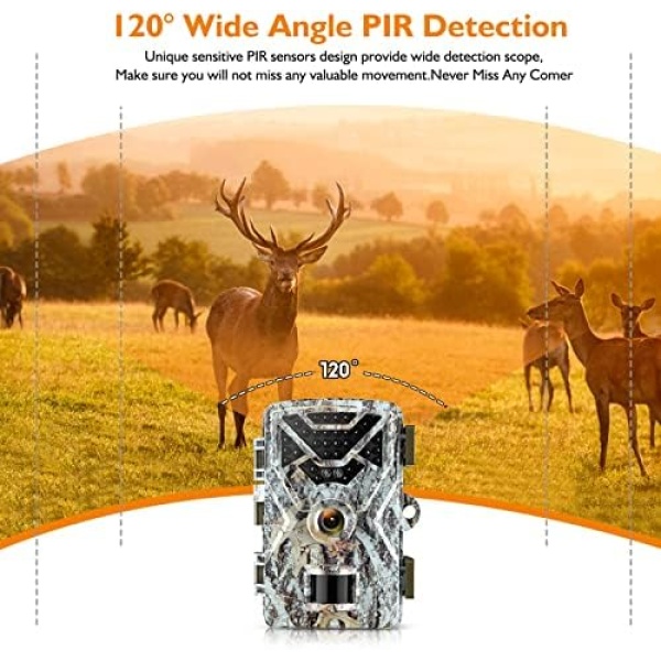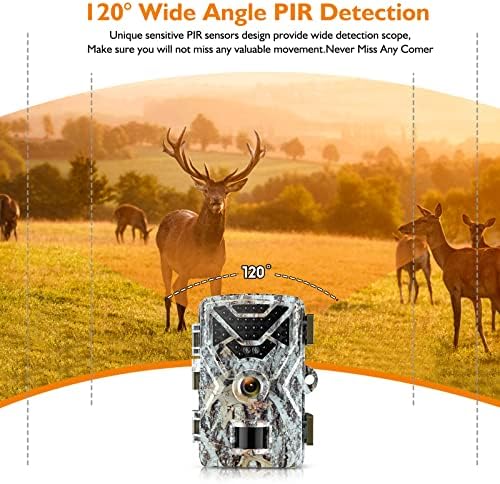 【EXCELLENT NIGHT VISION &120° Wide Angle】 The game camera built-in 34pcs 850nm infrared lights.Low-glow infrared technology is more concealed and not easily detected by animals.And this trail camera has 120°wide-angle detection range, which can capture more wonderful images and allow you to get a wider field of view.