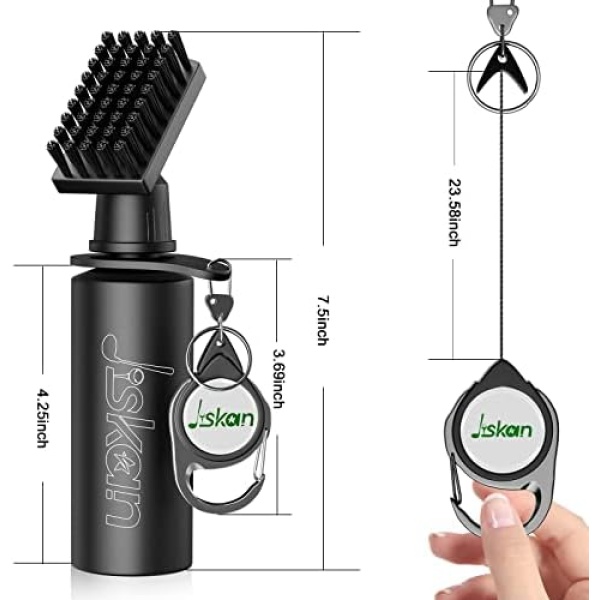 【Unique Design Golf Club Cleaner 】Jiskan Brush with Squeeze water bottle’s body 7.5 inches, holds 4 Ounces of water, It allows you to switch between washing and dry brushing when you play golf in the field