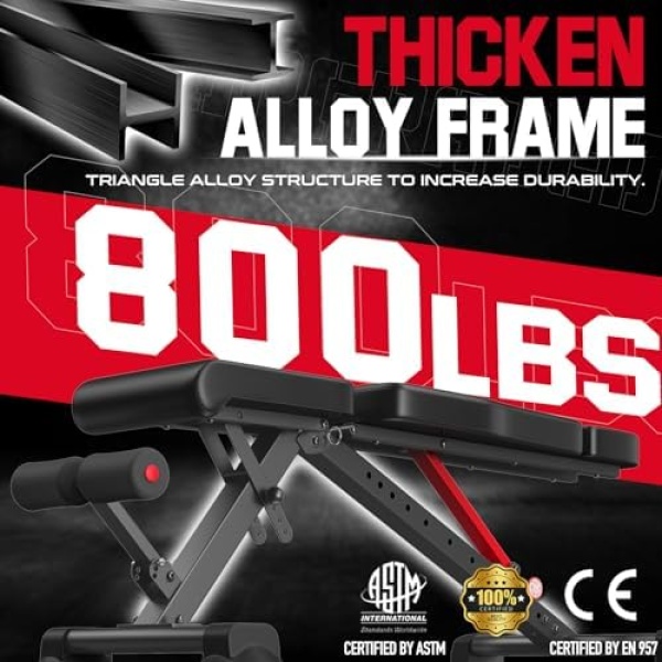 Weight Capacity: Up to 800 LBs – The adjustable weight bench is designed with a unique frame in a triangular structure and made of heavy-duty commercial quality steel. With it being 800lbs, the weight capacity gives you a safe fitness experience without any no worry of instability.