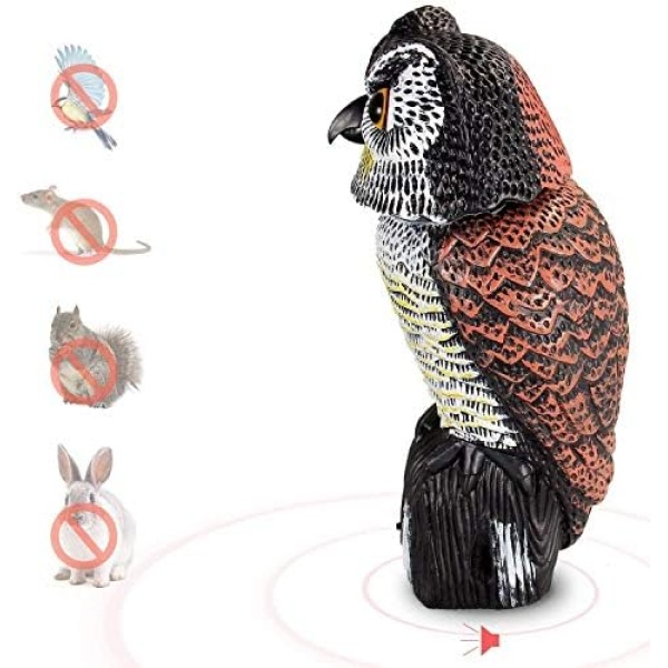 Ohuhu Horned Owl Decoy with 3 Different Tweets & Rotating Head, Fake Owl Scarecrow Statue