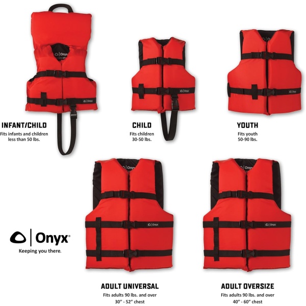 The Onyx General Purpose vest features classic open sided styling at an affordable price. Quick release buckles and 1″ belts provide a secure fit. These vests are U.S. Coast Guard approved. Available in infant, child, youth, adult universal and adult oversize to outfit the entire family, and bright colors to add visibility on the water. The Adult Universal vest fits chest sizes of 30″ – 52″, and over 90 lbs and Oversize vest fits chest sizes of 40″ – 60″, and over 90 lbs.