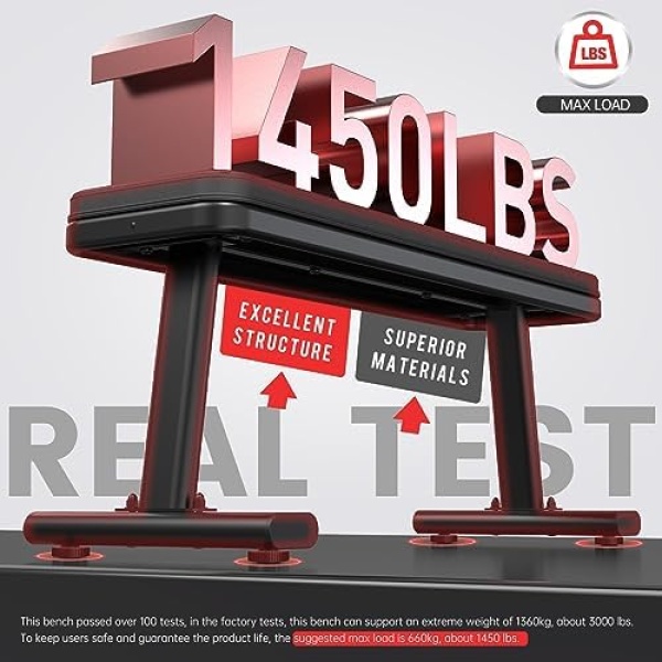 【Real Load Capacity up to 1450LBS/660KG】 The PASYOU PW100 Flat Weight Bench is constructed with sturdy and thick steel tubes. This workout bench has passed 100 rigorous tests, demonstrating its remarkable ability to support weights of up to 1360kg, which is approximately 3000lbs. To ensure user safety and product longevity, the recommended maximum load capacity is 660kg, roughly equivalent to 1450lbs,which is much sturdy enough for most users.