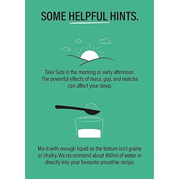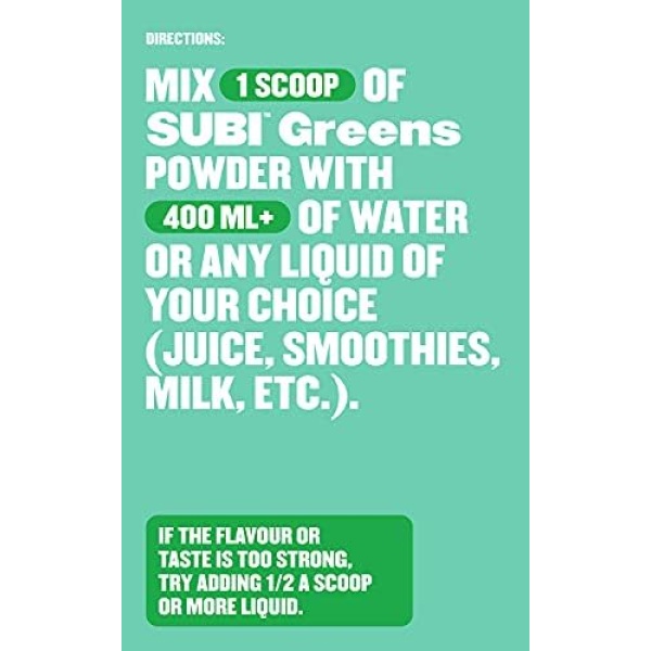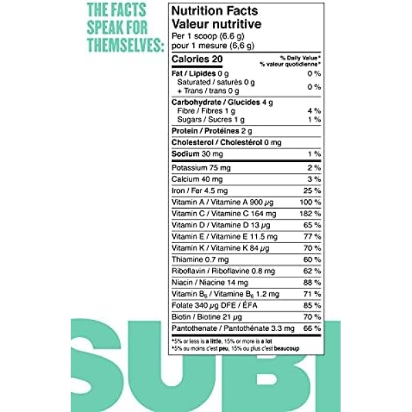 We try our best to fuel our bodies with leafy greens and nutrition that comes from all-natural sources, but sometimes life just gets in the way. We made Subi so that natural nutrition could be convenient and accessible to everyone. A serving of Subi in the morning provides you with 4 servings of nutrient dense greens and >60% of your daily nutrition. There’s something freeing knowing that you started off your day covering most of your nutritional needs. We make eating your veggies simple: just scoop, mix and sip! Mix one tiny, 7-gram serving of Subi into 375mL or more of your favourite morning beverage (water, tea, smoothie – dealer’s choice!) and fuel yourself with all-day energy.