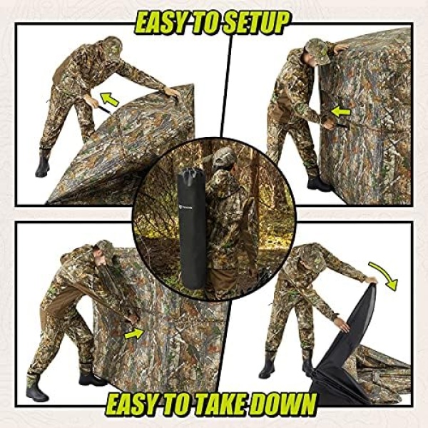 【Easy to Carry & Assemble】Unique pop up design without a complex procedure, enables you to easily setup and take down the blind quickly. A lightweight portable carrying bag is also included with the blind. You can take the blind anywhere for deer hunting, turkey hunting, elk, and more.