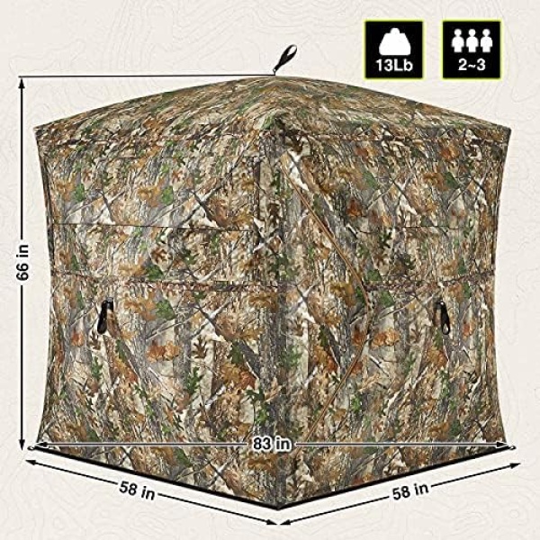 【Adequate Space】Dimensions: 66” height, hub to hub 75″ x 75″, and with a floor space of 58″ x 58″. TIDEWE hunting blinds can comfortably accommodate two or three hunters.