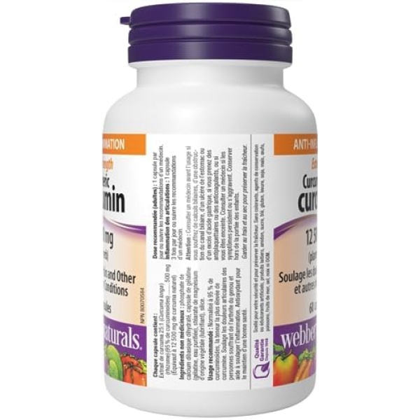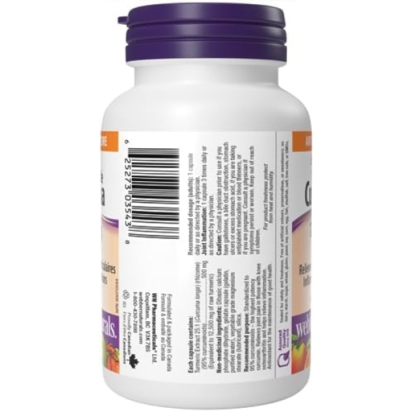 Extra Strength Turmeric Curcumin from Webber Naturals contains 500 mg of turmeric extract in every capsule, standardized to 95-Percent curcuminoids, one of turmeric’s active constituents. Turmeric is used in herbal medicine to help relieve joint inflammation and to provide antioxidant protection for the maintenance of good health.