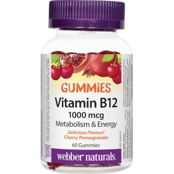 Vitamin B12 from Webber Naturals is a one-per-day, delicious gummy providing 1000 mcg of vitamin B12. These cherry-pomegranate-flavoured gummies support energy metabolism, red blood cell formation, and normal immune function, as well as help prevent vitamin B12 deficiency.