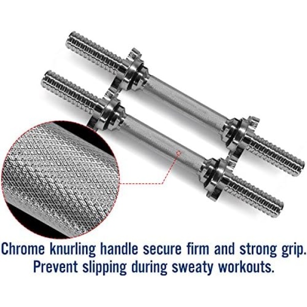 Well made construction lasts a lifetimeyes4all dumbbell handle is a must-have item for any fitness addicts to add into your collection. Constructed of high quality steel, our dumbbell handle is strong and sturdy enough to prevent it from bending or breaking under constant usage. In addition, the handle is covered with textured chrome coating finish to provide a firm, secure and non-slip grip even with sweaty hands. Universal design fits all 1-inch-hole weight platesour adjustable dumbbell handles have 1-inch diameter sleeves and therefore are only compatible with regular pancake plates with 1-inch diameter center holes. Fully equipped with star-lock collars threaded star-lock collar with loose-resistant rubber trim design provides safe and easy plate changes. Only take seconds for you to affix and slide off weight plates during your workout! Product specificationsset of 2 dumbbell handlesdimensions: 14 inch length x 1 inch diametermaterial: high quality steel with chrome coating finish5-inch knurled handle for a non-slip gripthreaded star-lock collar with loose-resistant rubber trimsbest warranty: 5 year satisfaction and 60 day free return.